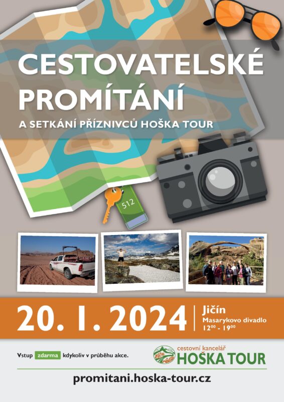 Cestovatelské promítání průvodců cestovní kanceláře HOŠKA TOUR – reportáže z cest do zemí dalekých i blízkých, za poznáním, turistikou i na kole: Národní parky USA, Island, Jordánsko, Ženevské jezero, Ötztal, cyklistika kolem Balatonu a další. Odpoledne plné cestovatelské inspirace s možností vyhrát zájezd a další ceny.