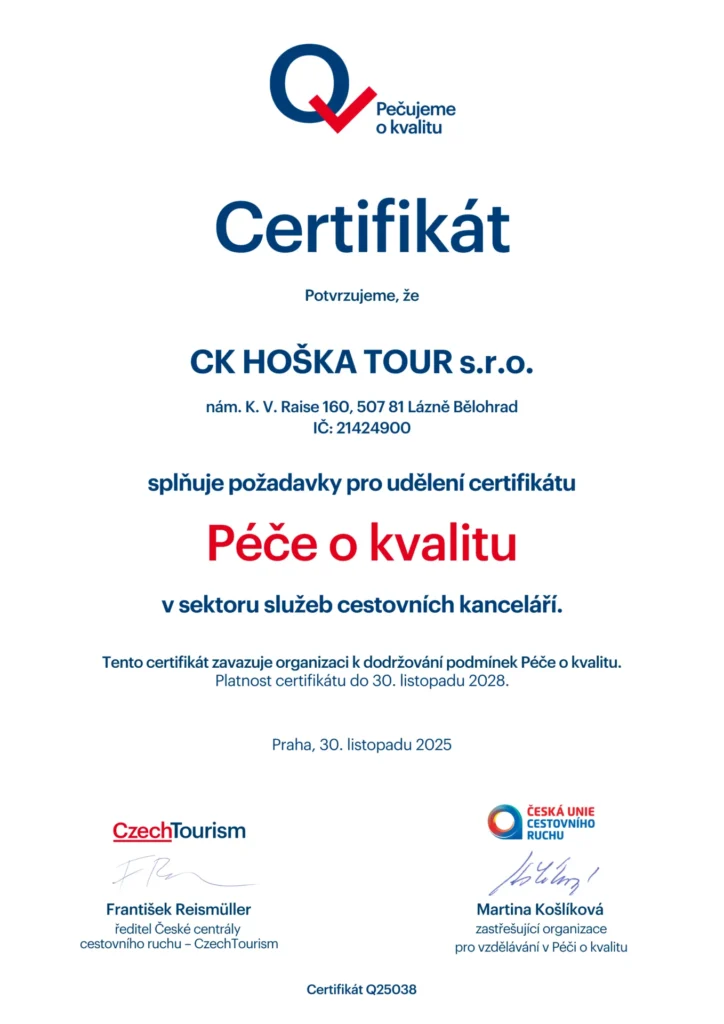 S radostí oznamujeme, že naše cestovní kancelář HOŠKA TOUR nově splňuje kritéria Značky Q – „Pečujeme o kvalitu“, oficiálního systému kvality služeb v cestovním ruchu pod záštitou Ministerstva pro místní rozvoj ČR. Toto ocenění potvrzuje, že dlouhodobě dbáme na profesionální přístup, bezpečnost našich klientů, odborné vedení zájezdů i transparentní komunikaci.