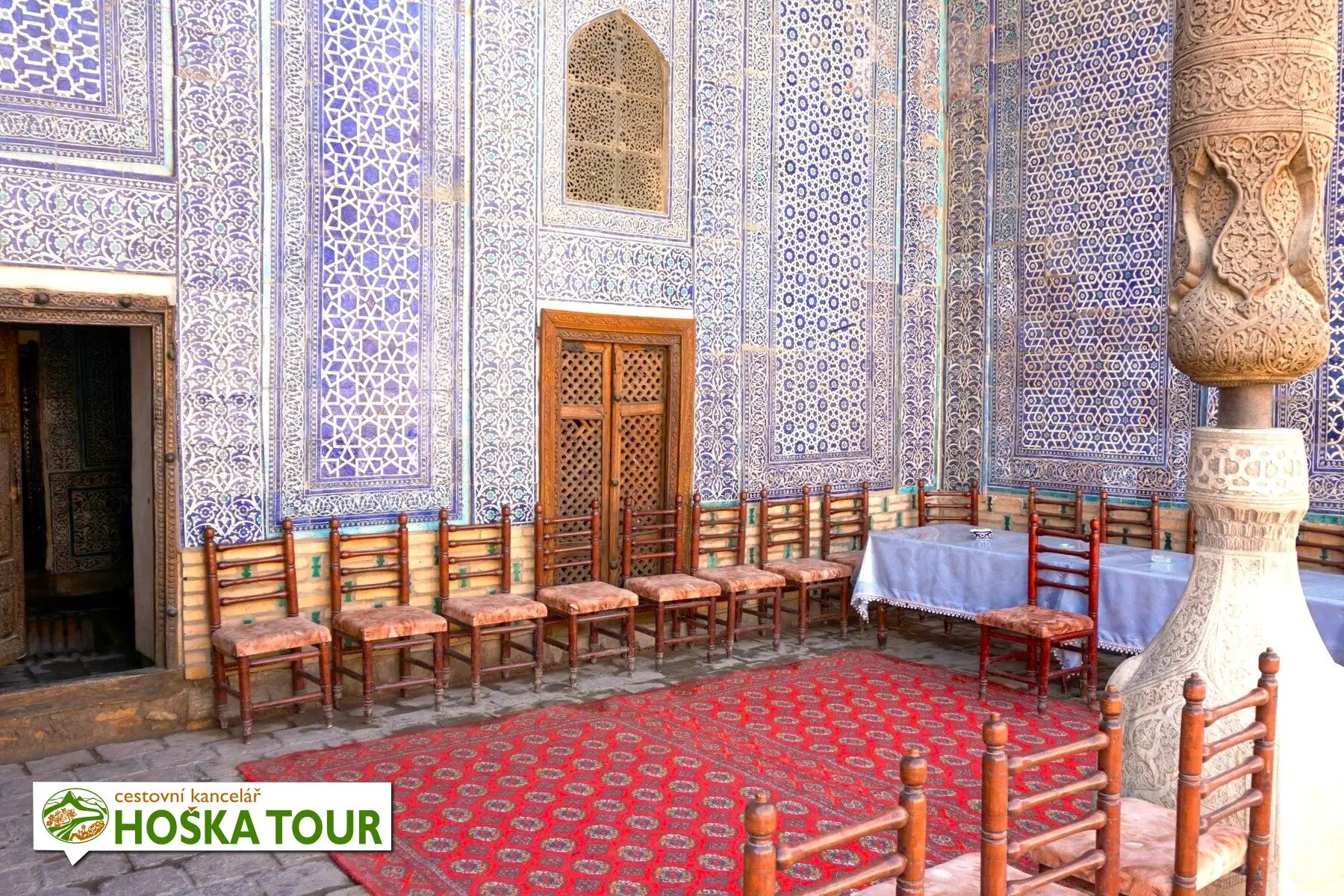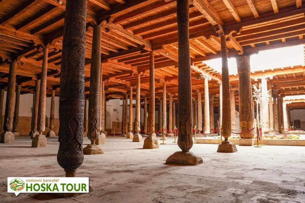 Mešita Džuma, tedy páteční mešita, patří k nejpozoruhodnějším stavbám v celé Chivě a výrazně se odlišuje od klasické podoby islámských svatostánků, jak je známe například ze Samarkandu či Buchary. Nenajdeme zde monumentální vstupní portál ani vysokou kupoli dominující panoramatu města. Stavba působí zvenčí poměrně nenápadně a její skutečné kouzlo se skrývá až uvnitř. Právě tato zdrženlivost a architektonická střídmost jí dodávají mimořádný charakter.