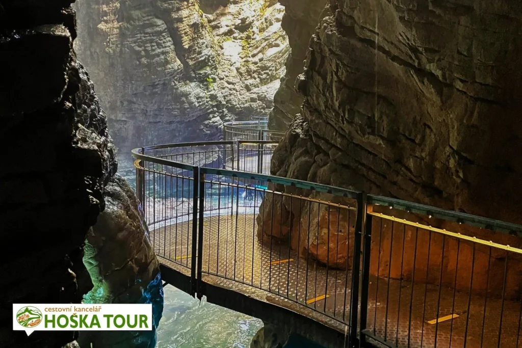 Součástí vstupu je přístup na dvě vyhlídkové plošiny – spodní část nabízí pohled do skalní soutěsky, horní terasa pak umožňuje bezprostřední kontakt s padající vodou z výšky téměř 100 metrů. Vzhledem k intenzivní vodní tříšti je vhodné počítat s vlhkým prostředím; lehká pláštěnka nebo bunda se hodí i v teplém počasí. Schodiště je pevné a zabezpečené zábradlím, přesto může být povrch kluzký.