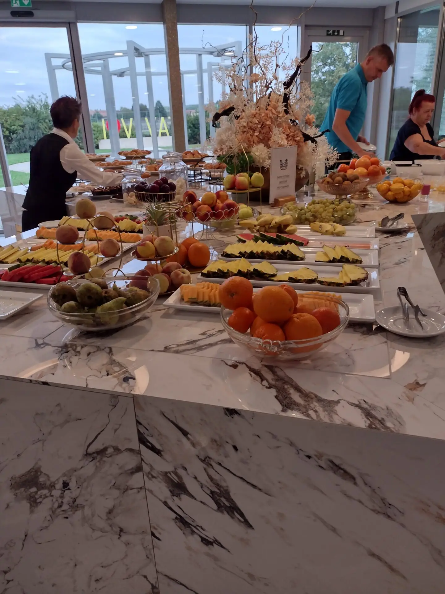 Jídlosuper výběr, hodně vína, ale chyběla čerstvá zelenina a někdo by je měl informovat, že Češi jsou po ránu na housku se salámem a ne na sladké, v hotelu otáleli s nošením dalších salámů, sýrů a houstiček, kdežto koláčů bylo moc